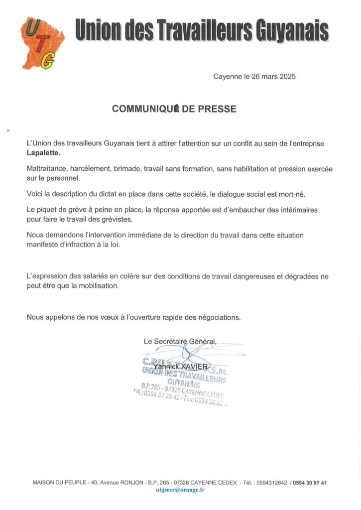 L’Union des travailleurs Guyanais tient à attirer l’attention sur un conflit au sein de l’entreprise